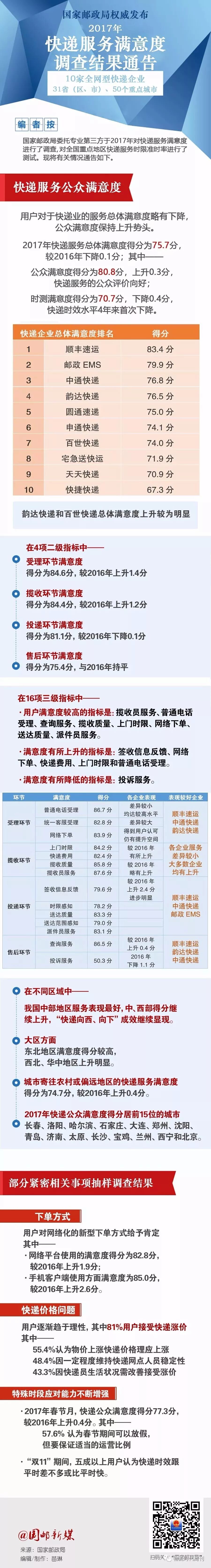 《通告》显示,快递企业总体满意度排名和得分依次为:顺丰速运(83.4分)、邮政EMS(79.9分)、中通快递(76.8分)、韵达快递(76.5分)、圆通速递(75.0分)、申通快递(74.1分)、百世快递(74.0分)、宅急送快运(71.9分)、天天快递(70.9分)和快捷快递(67.3分)。