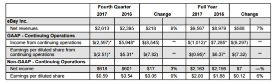 在整个2017财年,eBay净营收为95.67亿美元,比2016财年的89.79亿美元增长7%。来自于持续运营业务的净亏损为10.12亿美元,相比之下2016财年来自于持续运营业务的净利润为72.85亿美元。不按照美国通用会计准则,eBay全年来自于持续运营业务的净利润为21.63亿美元,与2016财年的21.56亿美元相比持平%。
