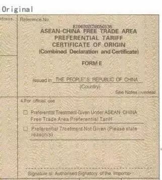 中国东盟自由贸易区优惠原产地证明书,简称《FORM E 证书》或《东盟证书》,英文名称为《ASEAN-CHINA FREE TRADE AREA PREFERENTIAL TARIFF CERTIFICATE OF ORIGIN FORM E》。FORM E 证书的签发,限于已公布的《货物贸易协定》项下给予关税优惠的产品,这些产品必须符合《中国——东盟自由贸易区原产地规则》。证书内容以英文填写。
